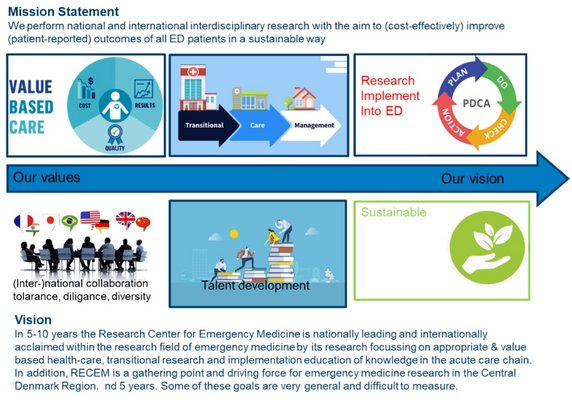 In 5-10 years the Research Center for Emergency Medicine is nationally leading and internationally acclaimed within the research field of emergency medicine by its research focussing on appropriate & value-based healthcare, transitional research and implementation and education of knowledge in the acute care chain. In addition, RECEM is a gathering point and driving force for emergency medicine research in the Central Denmark Region.